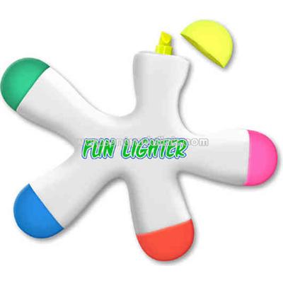 Fun Lighter (TM) - Interestingly shaped highlighter offers 5 highlighter colors in one. Fun Lighter fluorescent highlighter. More than just a great conversation piece, this interestingly shaped highlighter offers 5 highlighter colors in one, and is ergonomically friendly. Highlighter ink colors include; fluorescent yellow, fluorescent pink, fluorescent green, fluorescent blue and fluorescent orange. Color: White Minimum Production Time: 7 day(s) Size: 3 3/16" x 9/16" x 3 3/4"