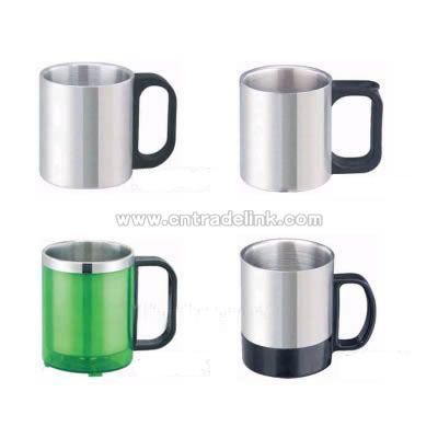 Stainless steel mug combination set includes a 16 ounce tri-roll travel mug and a 12 ounce tri-roll desk mug. FDA compliant materials. Patented set.