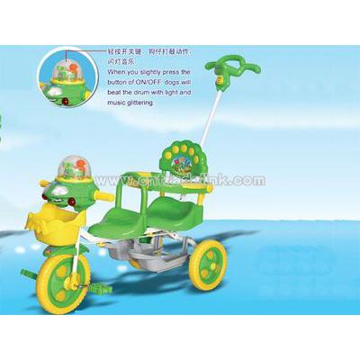 Description:Children Tricycle Packing:Color box MEAS:78*33*46.5cm CBM/CTN:0.120 PCS/CTN:2 Product Size:85*46*91cm G.W./N.W.:11.9/10.4kg Features: Two seats for two children to ride on Parents can push tricyle forward and turn direction by handing push pole easily Amazing toys on the top of head beam:When you slightly press the button of ON,dogs will beat the drum with light and music glittering With basket