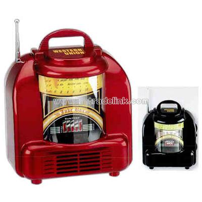 AM / FM juke box style radio. Let this classic 1950's style radio take you back to the good old days. You are sure to enjoy all of your favorite tunes on this old fashioned diner style juke box radio. Uses 4 AA batteries (not included). Case dim: 19" x 12" x 27". Color: Black, Red Size: 5" x 4 3/4" x 3"