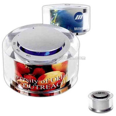 Clear acrylic FM radio is a perfect vehicle to feature full color graphics. Pushing down on the top of the unit activates the radio and a blue light illuminates for 10 - 15 seconds. Once on, turning the top of the unit tunes the station and the volume is adjusted simply by turning the outer case. Item size 2 1/2" x 4" dia. Material: Acrylic Size: 2 1/2" x 4"