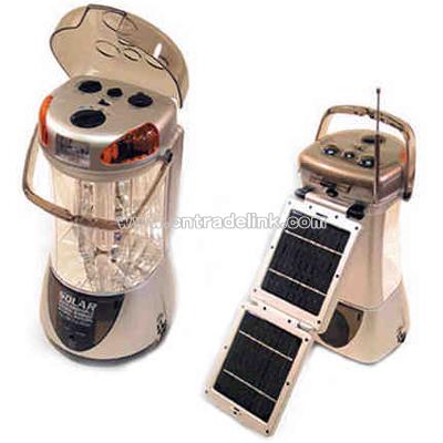Solar rechargeable lantern with AC/DC charging adapter, 9 watt energy saving fluorescent U-tube and automatic turn on system for power outages, imported. Long light output-7 to 12 hours, AM/FM radio and NOAA weather channel, emergency flashing strobe light, blinking lights/sonic alarm. Fold out solar panel recharges battery utilizing sunlight. Color: Silver-Black