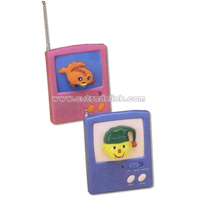 Colorful imported FM scan radio with character that has moving lips. Use stock character or create your own, using a mascot, corporate icon, or spokesperson.