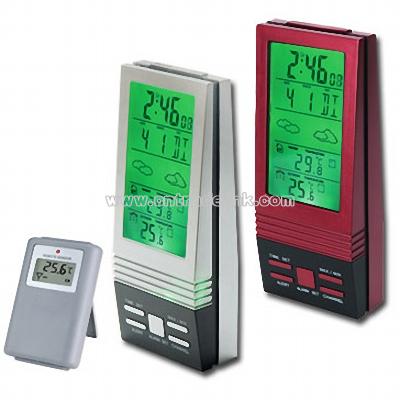 LCD alarm clock with digital calendar, Radio controlled clock, Auto DST for atomic clock time, world time zone. 7 Languages available for day display: English/French/German/Spanish/Italian/Dutch/Danish. Indoor &outdoor thermometer & hygrometer, RF outdoor thermometer & hygrometer with up to 3 channels. Temperature tendency, Min. & Max. Temperature record. Alert for temperature upper limit & lower limit, Graphics mode weather forecast, Moon phase display, Condition easiness indication, Low voltage indicate for wireless sensors, LED backlight. Unit Size: 145*133*60mm.