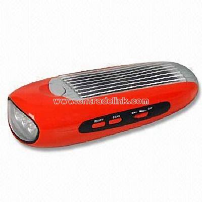 Solar torch with FM radio LED: 4 pieces diameter: 5mm LEDs, brightness is of 12000mcd Battery: Lithium battery (3.7V 120mAh) Functions: 4 pieces super-bright LED lamps, solar panel and FM radio Model: LD29037B Torch with FM radio Functions: 4 pieces super-brightness LED lamps, hand cranking cellphone charger and FM radio