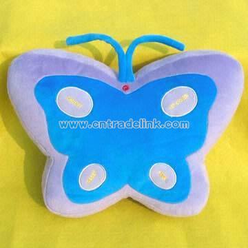 Novelty radio: a FM scan radio built in stuffed and plush toy: butterfly pillow/cushion The novelty radio with 6 function control buttons on the front Radio band coverage from 87.8 to 108.4MHz Radio powered by 2 AA size batteries The butterfly pillow/cushion made of plush velboa Pillow/cushion stuffed with polyester fiber A good promotional item Can be in any other colors as buyer requires