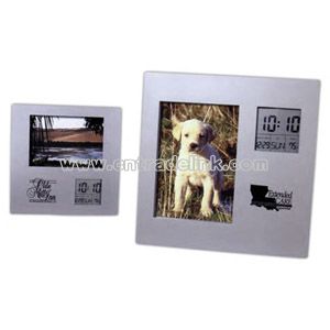 Rotating photo frame with LCD thermometer/alarm clock with an audible alarm and digital temperature. This attractive silver finish photo frame provides more than just a pretty picture. In addition to featuring your 5" x 3 1/2" photo, it prominently displays time, date, day and temperature. A unique rotating clock assembly and easel back permit you to use this photo frame in either a horizontal or vertical position. Requires 2 AAA batteries. Size: 7" x 7" x 3/4"