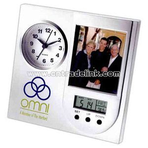 Analog alarm clock with second hand, LCD display with date and temperature. Photo frame holds 2 1/2" x 3" picture. AA batteries included, (not inserted). Size: 6 1/4" x 6 1/4"