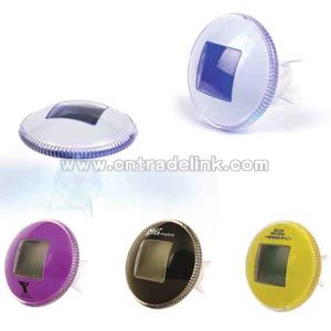 Space ship shape clock flashes 5 different colors to light up your desk. Rotate from four directions to achieve different functions with alarm, day, date and temperature. 3"AAA" batteries included. 3 7/8" diameter x 3". Color: Black, Purple, White, Yellow Size: 3 7/8" x 3"