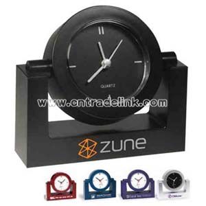 Swivel clock, quartz analog with weighted base, clock swivels to read at any angle, includes 1 AA battery, not inserted. 5 1/8" x 4 5/8" total size, 5 1/8" x 2 13/16" base. Color: Black, Metallic Blue, Metallic Purple, Metallic Red, Silver Size: 5 1/8" x 4 5/8"