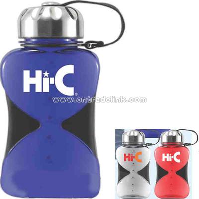 Dyno-Grip Active - 36 oz. water bottle with rubber cap accent. 36 oz. water bottle. Bright translucent color, sporty black rubber cap accent. Flip-up rapid flow drink spout and contour shape for easy-grip. Freeze bar included. Overall size: 10" x 4" diameter. Color: Translucent Blue, Translucent Green, Translucent Orange, Translucent Purple, Translucent Red, Translucent Smoke Minimum Production Time: 7 day(s) Size: 36 oz