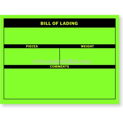 Fluorescent Green Bill of Lading Labels Get Noticed! ? These labels help you clear customs or give instructions to the shippers. ? These shipping labels stick well to cartons, shrink wrap or drums. Material Features ? Fluorescent labels are hard to miss. ? Write on this paper label material using a pencil, typewriter or ball-point pen. ? Acrylic adhesive keeps labels in place. Yet, you can remove this label cleanly. Size 3" x 4" (H x W)