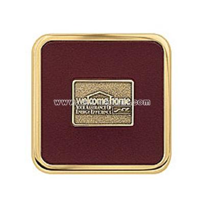 Brass square coaster adds a touch of elegance to the boardroom or executive office. Brass plated zinc/leather/cork ? 3-7/8" square ? Shown with RQC medallion ? Please specify leather color ? Our heavy Coaster Weight coasters make excellent gifts ? See general information for other coaster options