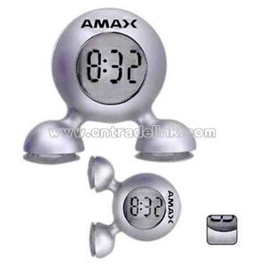 Bubble clock with suction feet that adheres to any flat surface. Turn the clock in any direction and the face maintains an upright position. Button cell battery included (inserted). Color: Silver Size: 2 11/16" x 1 11/16"