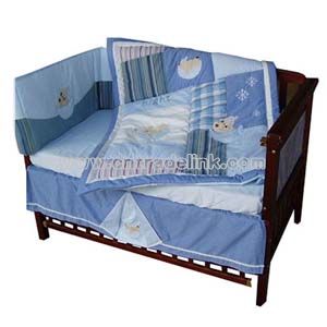 Product Description 4-PC set cotton bedding set for baby cot, supplied with comforter, bumper, bed skirt and fitted sheet. Packing details: Six sets per carton, inner packing by PVC bags.