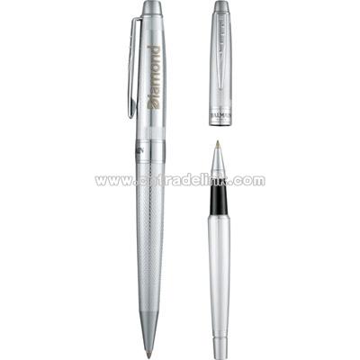 Welcome a new member to the team with this finely-engraved pen set. Includes the Balmain Kensington Roller Ball (#1035-56) with standard European black roller ball ink cartridge and the Balmain Kensington Twist (#1035-57) with standard European black ballpoint ink cartridge. Set includes display box for two pens which doubles as a desktop valet, and vinyl carrying pouch for the set. Material: Brass Dimensions: H 2.5" x W 7.5" x L 6" Available Color: Silver