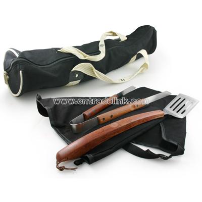 4pce Set include: Canvas bag, apron, BBQ tongs and BBQ spatula Both tong and spatula are stainless steel with wooden handles Overall dimension: 57cm