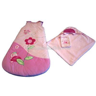 Sleeping bag for baby and children Size:Approx 50*90CM Shell:250GSM Velour+Embroidery Inside:150GSM Interlock Fabric Filling:180GSM Polyester wadding We have our own copyright design for boy and girl. Any OEM cartoon printing on sleeping bag is workable.