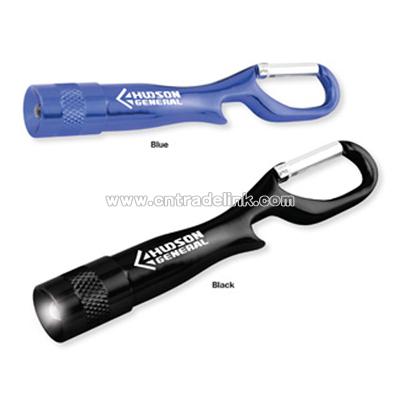 Bottle opener with LED flashlight and carabineer. Battery included. Colors Available: Black and Blue