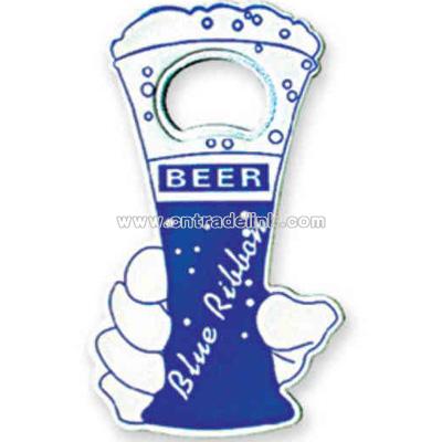 Beer glass shape bottle opener with magnet. Jumbo size beer glass shape bottle opener with magnet. It has a solid metal ring to get tough job done. It has a refrigerator magnet in the back. Custom shape and color are welcomed. Material: Metal, Plastic Color: Blue Minimum Production Time: 7 day(s) Size: 4 3/8" x 2 1/2"
