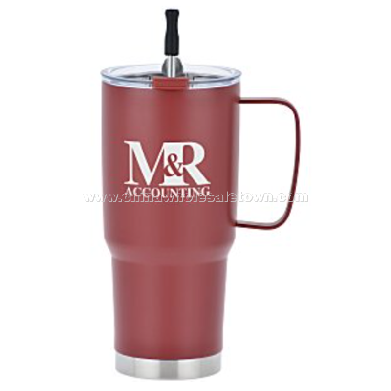 Bring your favorite drink with you in these custom mugs! Mugs feature a large, rectangular handle for easy transport. Mugs include a matching-colored straw for easy sipping. Use these mugs to stock your business's shelves! Mug: Double-wall stainless steel Lid: Acrylic Straw: Stainless steel with silicone tip Insulation: Vacuum Closure: Push-on lid with flip-top drink opening Includes: Wire cleaning brush Finish: Matte Includes 9.5" straw Capacity: 30 oz