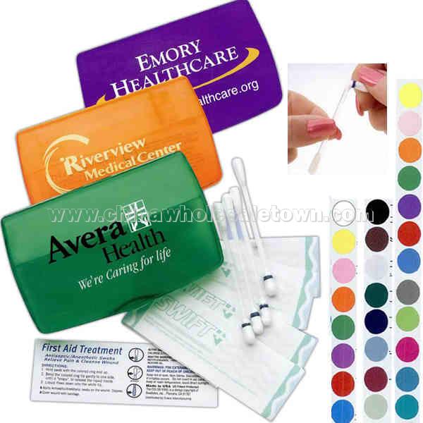 First aid kit in an ultra trim case contains 4 Swabplus swabs, four latex fee vinyl bandages and instructions. Hold ringed tip up, gently bend tip until it "snaps". Size:2 9/16" x 4 1/8" x 1/2" Imprint Size:Front or back 1 3/4" x 3 1/2" Product Options: Up to 4 assorted colors available at no additional charge. White ink recommended for the best imprint visibility on most Tropi-Cool (TM) translucent colors Tropi-Cool (TM) PRODUCT COLOR Translucent Red, Translucent Blue, Translucent Green, Translucent Purple, Translucent Orange, Translucent Smoke, Translucent Pink, Translucent Yellow, Translucent Frost, Translucent Aqua, Translucent Sky Blue, Translucent Lime, Call for more Details