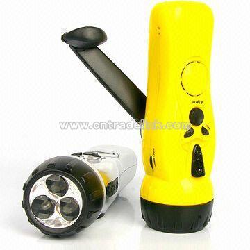 Flashlight Radio FM Radios and LED Flashlight Radio for Outdoor Lighting, with Mobile Phone Charger Key Specifications/Special Features: FM radios and LED flashlight radios for outdoor lighting, with mobile phone charger Quality/safety certification: ISO 9001, CE, RoHS Environmental-friendly, never needs batteries, mobile phone charger, 1/3 LEDs Rain-resistant, built-in battery, wind up recharge, patented product and ergonomic design Dynamo and FM radio Three white LED lights 45,000mcd providing superior illumination Battery: 80mAh Output voltage: 80mAh, 6V One minute cranking provides 90 minutes lighting for one LED One minute cranking provides two to eight minutes mobile speaking time Alarm buzzer, mobile phone charging facility Recharged by handle-cranking Logo printing services are available
