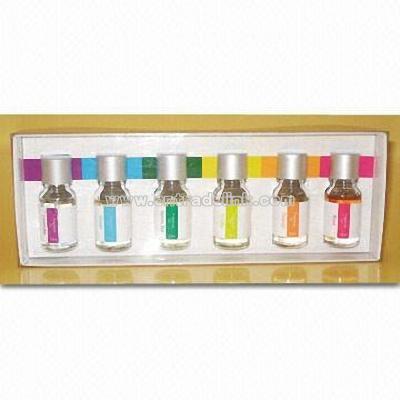 Fragrance Oil with Silvery Cap With silvery cap Capacity: 6 x 10ml Size: 8.5 x 24 x 3cm Packing: Quantity: 36 sets/carton Carton size: 38 x 26 x 27.5cm Net weight: 9.72kg Gross weight: 10.72kg