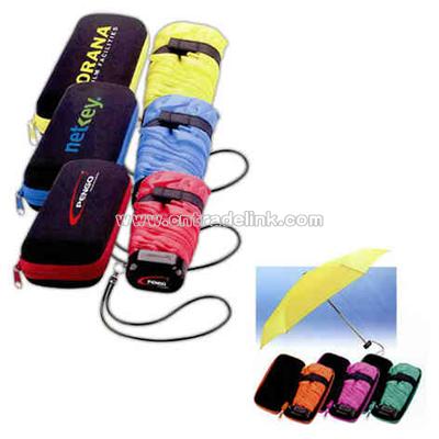 Folding 5-section polyester umbrella with deluxe zippered black carrying case with matching trim under umbrella, plastic handle, aluminum frame, and wrist strap. Material: Polyester Color: Blue, Green, Orange, Pink, Red, Yellow Size: 34"