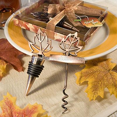 Here’s a wine themed favor with a distinctive fall feel that really “sets” the standard. This set of two wine tools contains a 4” x 1 ?” bottle stopper and a 4 ?” x 2” bottle opener. Each tool is made of sturdy copper colored metal with a cutout leaf design at its top – the opener with a grip handle and corkscrew bottom and the stopper with a conical gasket-wrapped base. Each bottle opener and stopper favor set comes packaged in a fall themed box with a clear acetate top resting in a seasonally-inspired leaf design base, tied with an copper organza bow and matching leaf design thank you tag. For a distinctive touch, add one of our personalized favor tags to your favors. Choose from over 100 design options, 2 shapes and 30 colors, to create a tag that is perfectly suited for any event. Simply personalized with your names or your event, and a date. They will arrive along with your favors and come with a prepunched hole and a 5" elastic tie, and simply need to be tied onto your favors once received.