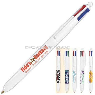 Ballpoint pen with medium point, white barrel and cap color, and four ink colors. Ballpoint pen with a white barrel and cap color. Multi-functional design. Four ink colors in one pen: black, blue, red and green ink. Medium point. Color: White Minimum Production Time: 5 day(s) Size: 5 11/16" x 5/8"