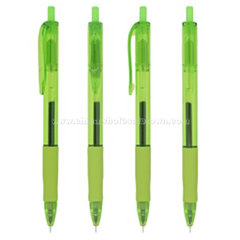 This custom retractable pen is perfect for tradeshows and offices alike! Translucent, plastic barrel Rubber grip Retractable Fine-point, blue gel ink