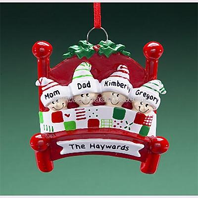 A stocking-capped family keeps warm under a Christmas quilt. We hand paint from 2-5 names, up to 8 chars. each, and any 1-line message, up to 16 chars. Resin. 3 1/2?H x 3.