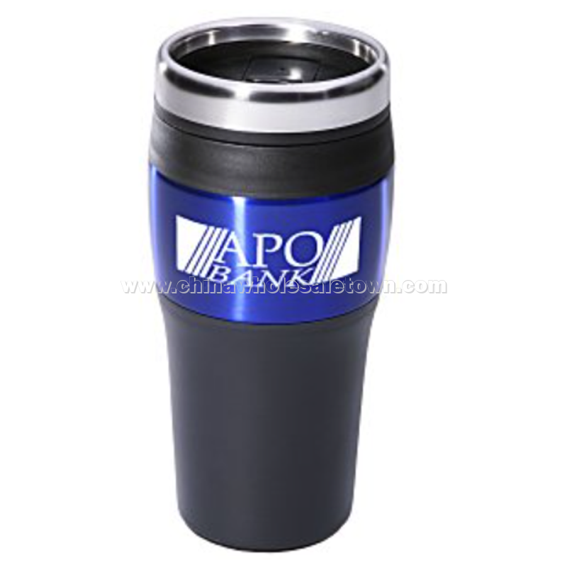 Drink the beverage of your choice out of these custom tumblers. Tumbler: #5 PP plastic with stainless steel band Lid: Stainless steel and #5 PP plastic Insulation: Air Closure: Screw-on lid with sliding closure Capacity: 16 oz