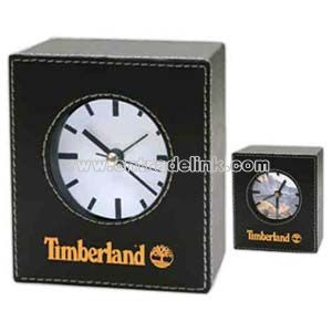 Metropolitan analog desk clock with alarm. Faux black leather case with white stitching. Clean modern look for office or home use. Uses 1 AA battery (not included). Available in black leather. Material: Leather Color: Black Size: 4 1/2" x 3 7/8" x 1 1/2"
