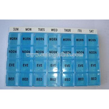 7 day (28 compartments) pill box with tray Product size: 18*11.5*2.50 cm *7pcs of 4 compartments pill case for 7 days. *Each 4 cell for breakfast, lunch, supper, , bedtime. *With braille on each case. *Can be printed different language on each case instead of breakfast, lunch, supper, bedtime. *Printing customer's logo is available. High quality products for promotion, travel, and daily use.