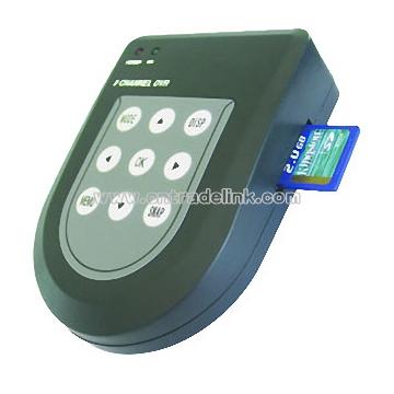 It is a 2 channel mini DVR, support max 2GB/8GB SD card, with the function of motion detection &take photos, display resolution: 720*480, display frame rate: 30fps(NTSC), 25fps(PAL) Video input format NTSC/PAL Video output (CVBS) 1 channel Video input (CVBS) 2 channels Display frame rate NTSC: 30fps; PAL: 25fps; Mode (sequence): Full/PIP Recording frame rate NTSC: 15fps; PAL: 12fps Recording mode Motion detection Display resolution NTSC: 720*480; PAL: 720*576 Recording resolution AVI: video: 320*240; Photo: 640*480 OSD English Back-up (archive device) SD card (up to 2GB) Search function Mode: Date & Time; F/Screen: Yes Motion detection Yes (Internal) Net weight 108g Dimension 115mm * 80mm * 31mm