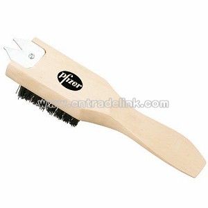 A nice gift for the golf outing! The wooden handle doubles as a shoe horn and includes a metal spike wrench and durable plastic bristles. Product Size:1 3/4" H x 8" W Imprint Area(s):1.25" x 1.50" (Back Of Brush) Imprint Method:Pad Print Shipping Weight:15 lbs. per 100