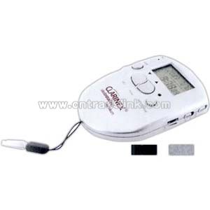 High impact plastic, mini digital voice recorder with alarm clock and timer. Material: Plastic Color: Black, Silver Size: 3.75" x 4"