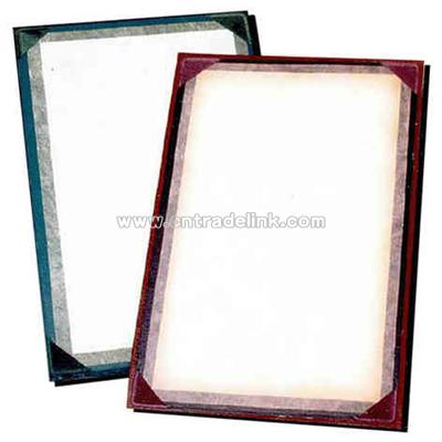 Double sided menu board with picture corner, holds two sheets. This simple yet elegant menu cover has four ribbon picture corners on each side to hold your inserts in place. Color: Black, Blue, Burgundy, Green Size: 8 1/2" x 11"