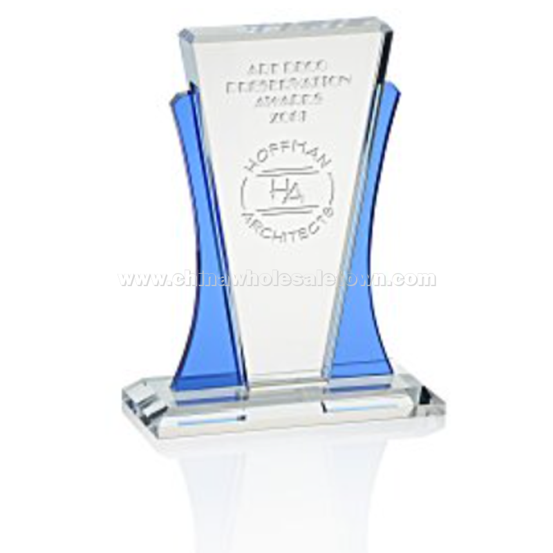Honor corporate, sales, academic or fundraising achievements with a crystal piece that lasts a lifetime. This self-standing award features a tapered shape with curved blue accents, broad face and a beveled base. Material: Crystal Clear center panel Curved blue accents Beveled, rectangular base Gift boxed Size: 9" H x 6-7/8" W x 3-3/16" D