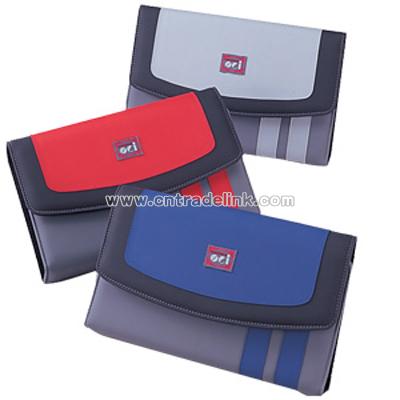 600D Polyester 6-3/4" X 11-5/8" * Zippered closure. * A stripe of mesh as decoration. * Double-sided CD inserts in non-static. * Total 12 sheets to hold 48 CD's.