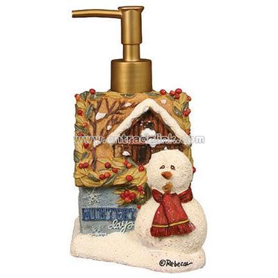 This fun, seasonal bath collection, inspired by the art of Rebecca Carter, shows different outdoor winter scenes and reminds us all how the winter season can be "Chilly" and "Frosty." The hand painted resin lotion pump features a snowman in his red winter scarf outside a warm blue cottage. Lotion/soap pump Hand-painted resin 7" x 3.88" x 4"