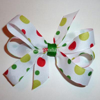 Just imagine this year's picture with Santa and this bow! Isn't it just perfect? Fun and feisty little polka-dots cover white grosgrain that will dance like sugarplums upon her head! Approximately: 3.5 inches wide Crafted of 7/8 inch grosgrain Attached to a partially-covered alligator pinch clip. All ends are sealed for durability.' Created in a smoke-free, pet-free environment.