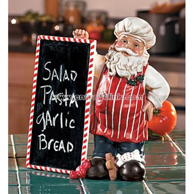 Chef Santa with Chalkboard. A festive hostess gift! Use this resin chef Santa in the kitchen to announce a holiday menu or message. In keeping with the Christmas season, his removable chalkboard has a resin candy cane frame. Chalk not included. (2 pcs. per set) Santa, 11 1/2"H x 8"W; board, 9 3/4"H x 5"W.