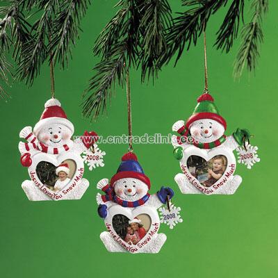 “Jesus Loves You Snow Much” Photo Ornament. Add cute pictures to these jolly resin snowmen! Each 3 1/4" ornament holds a 1" x 1 1/2" photo.