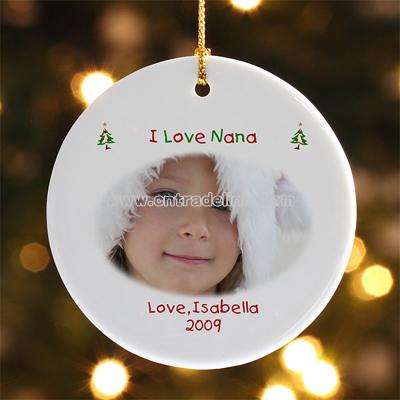 Surprise Grandma, Mom, Dad or Grandpa this holiday season with our exclusive photo ornament that's guaranteed to warm their hearts year after year! measures 2 3/4" in diameter; includes cord for easy hanging. Then choose any title to suit your needs, from I Love Grandma to We Love Papa surrounded by festive Holiday trees positioned above your photo. Click on Personalization Ideas to view additional title ideas. Cropped photo imprint measures approx. 2"W x 1 1/4"H with an adorable faded effect. Close-up photos of a single head shot are ideal.