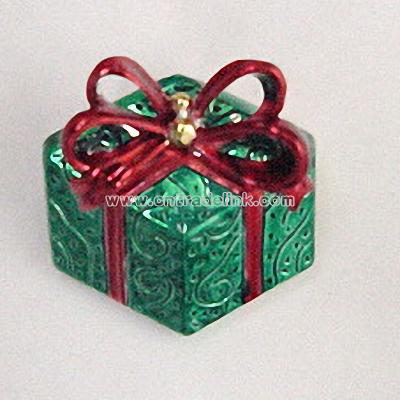 The Christmas gift slide has color and detail that make this costume jewelry boutique quality. The slide is crafted with the look of textured paper and an open bow, a difficult accomplishment considering that it is stamped from brass. This Christmas jewelry, is finished with jewel tone color, measures 1 5/8" X 1 3/8", and can be worn as a pendant or a pin.