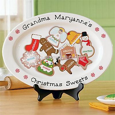 A Personal Creations Exclusive! This charming holiday platter 搒erves up?the names of all her delectable little ones! Crafted of white ceramic, it features a peppermint border and a tempting assortment of Christmas cookies. We add any title (Grandma, Mom, etc.), up to 20 characters, on top and include up to 18 cookies with names (up to 9 characters each) in the center. Platter will always say 揅hristmas Sweets.? Please note: When you select from 1 - 6 cookies, the design will always show 6 cookies. If you select 7 or more that is the number of cookies that will appear on the platter. For decorative use only. Platter measures 15 3/4"L x 11"W .