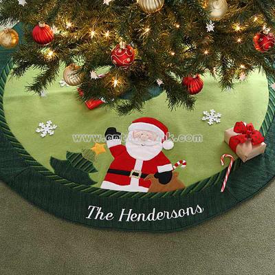 Create a family heirloom to cherish for years to come; we artfully embroider any family name in snow white thread across the front. Festive design features a joyful Santa surrounding the circular tree skirt with appliqué snowflakes falling around him. Beautifully crafted in plush felt with exquisite detail all the way around. Tree skirt measures 47" in diameter. Features hidden velcro closure at edge of skirt to seamlessly secure in place.